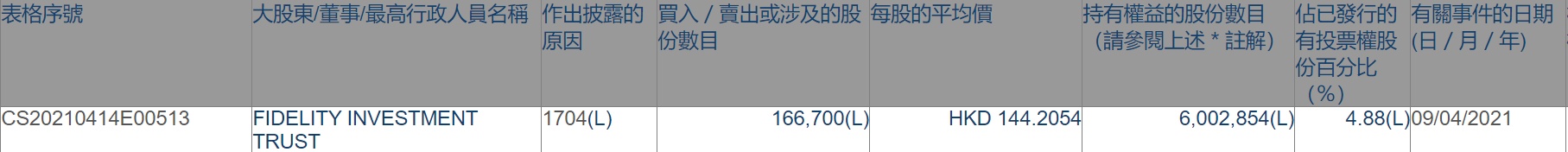 智通财经APP获悉,香港联交所最新资料显示,4月9日,FIDELITY INVESTMENT TRUST减持泰格医药(03347)16.67万股,每股作价144.2054港元,总金额约为2403.90万港元。减持后最新持股数目为600.2854万股,最新持股比例为4.88%。
