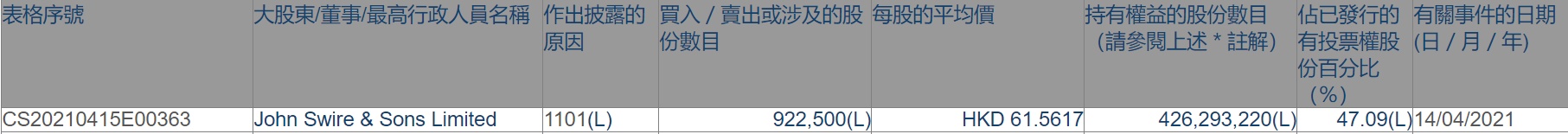 智通财经APP获悉,香港联交所最新资料显示,4月14日,John Swire&Sons Limited增持太古股份公司A(00019)92.25万股,每股作价61.5617港元,总金额约为5679.07万港元。增持后最新持股数目约为4.26亿股,最新持股比例为47.09%。