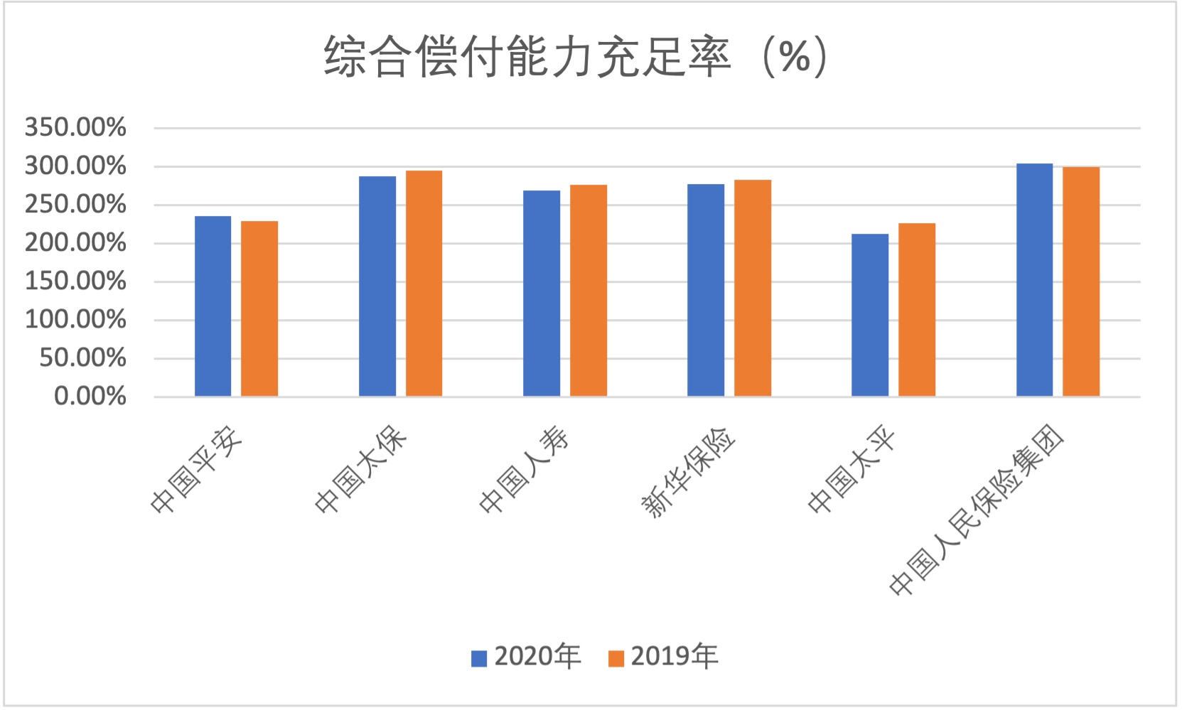 单纯从保险公司经营风险角度来看,偿付能力充足率越高,则表明公司风险抵御能力越强。从年报数据来看,上述六家企业综合偿付能力充足率均高于200%,且大部分公司2020年综合偿付能力充足率相较2019年实现增长,中国平安和中国人民保险集团则实现微降。