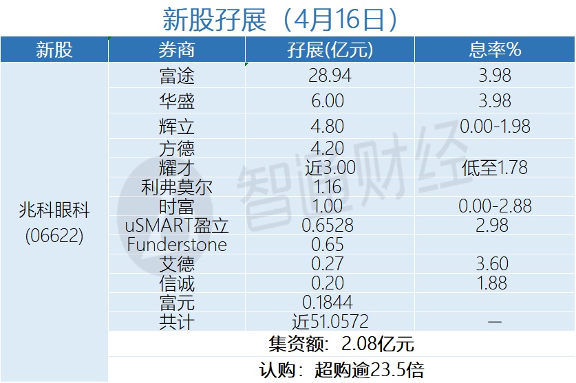 智通财经APP获悉,兆科眼科(06622)正在招股中。截至4月16日,辉立、耀才等合计为其借出51.0572亿港元,超购逾23.5倍。