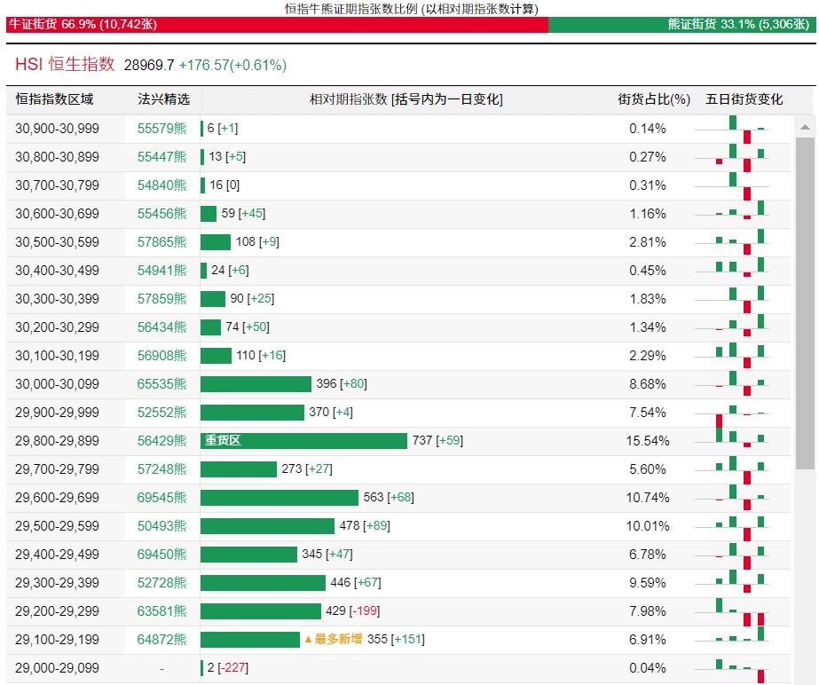 法兴恒指牛熊证街货分布图中的数据显示,熊证街货重货区在29800-29899区间,该区间最新熊证数量为737张,较上一交易日增加59张;最多新增在29100-29199区间,该区间最新熊证数量为355张,较上一交易日增加151张。