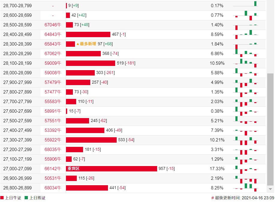牛证街货重货区在27000-27099区间,该区间最新牛证数量为957张,较上一交易日减少15张;最多新增在28300-28399区间,该区间最新牛证数量为97张,较上一交易日增加68张。