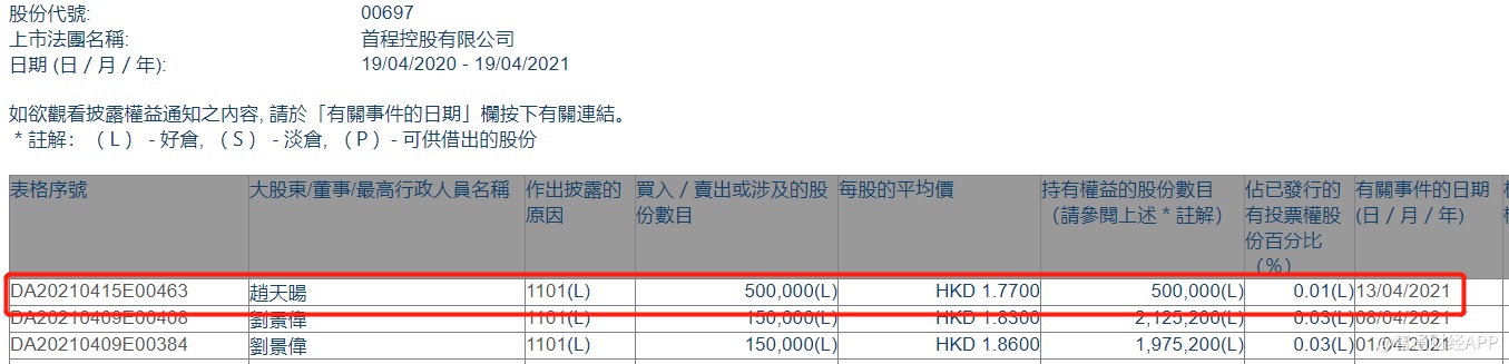 董事会主席赵天旸增持首程控股(00697)50万股,每股作价1.77港元