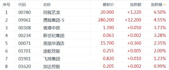 港股市场中,今日旅游及观光板块强势拉升,板块涨幅近4%。个股方面,同程艺龙(00780)大涨6.5%领涨,携程集团-S(09961)上涨4.55%,香港中旅、新世纪集团皆涨逾3%,其它概念股则纷纷跟涨。