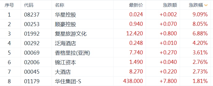 而酒店及度假村板块今日亦有所上涨,板块整体上涨2.17%。个股方面,华星控股(08237)涨超9%领涨,顺豪控股(00253)上涨8.05%,复兴旅游文化涨近7%,泛海酒店等个股皆随之上涨。