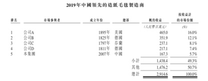 据弗若斯特沙利文数据显示,中国市场五大造纸毛毯制造商按2019年收入计算共计占市场份额约49.3%。环龙控股名列中国市场前五大造纸毛毯供制造商,且为唯一一间总部设于中国的造纸毛毯制造商,按2019年收入计占市场份额5.7%。