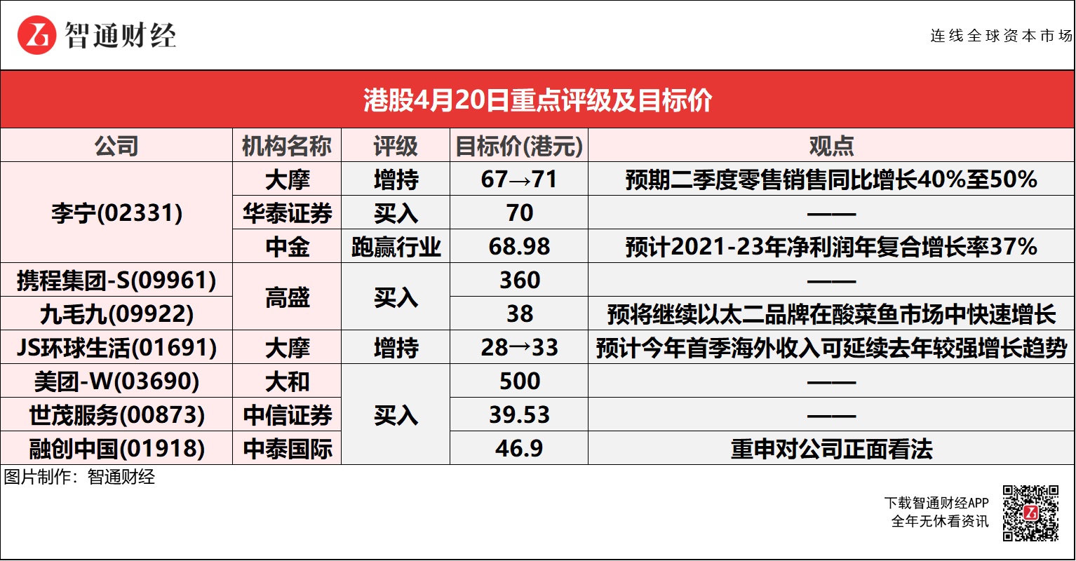 大摩上调李宁(02331)目标价10.9%至71港元,并分别调高今明年销售及盈利预测7%-9%及11%,预期Q2零售销售可同比增长40%-50%;
