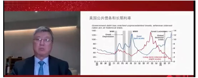 朱民在演讲中举例提到的美国,其实就是个非常典型的例子。蓝色的线是美国公共债务,红色的线是长期利率。