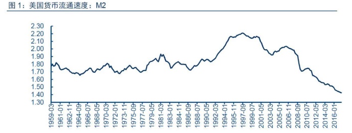 但如果你跑去观察货币流通速度V,则会发现是不断下降的。
