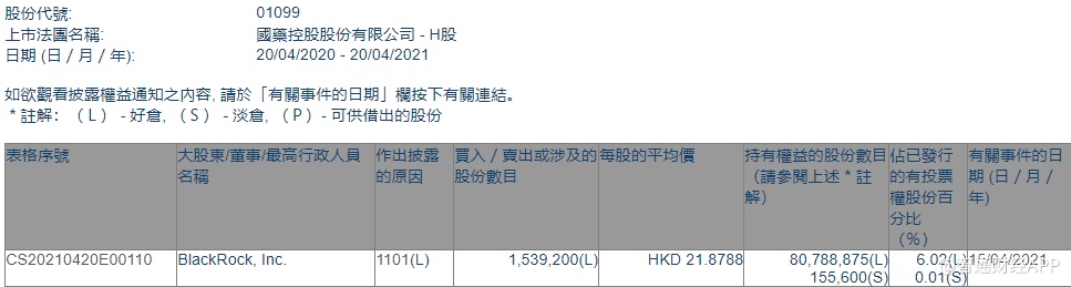 智通财经APP获悉,香港联交所最新资料显示,4月15日,贝莱德增持国药控股(01099)153.92万股,每股作价21.8788港元,总金额约为3367.58万港元。增持后最新持股数目约为8078.89万股,最新持股比例为6.02%。