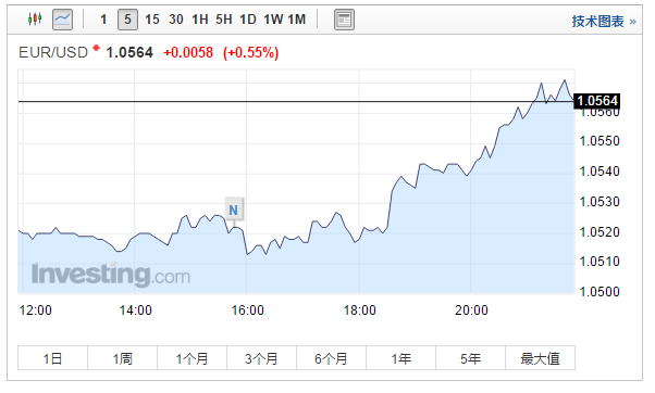 调查结果公布后,欧元兑美元上升逾40点,北京时间21点55分左右报1.0564,涨58点,涨幅为0.55%。