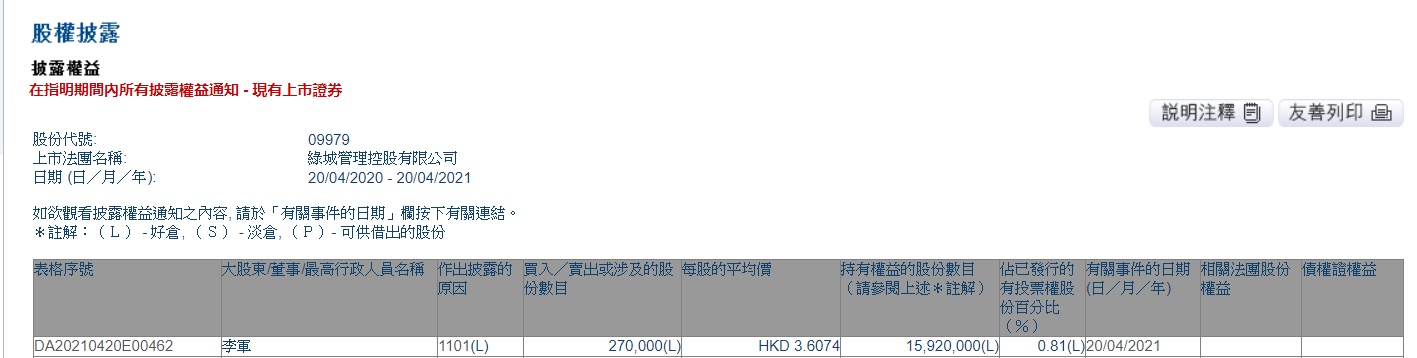 在4月20日的增持后,加上其拥有公司未归属的390万股奖励股份,李军实际拥有绿城管理控股1592万股,占公司已发行股本的0.813%。