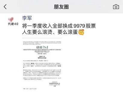在第三次增持自家股票后,4月20日晚间21:23分,李军将公告图文帖于微信朋友圈中,并配文:”将一季度收入全部换成9979股票。人生要么滚烫、要么滚蛋。”