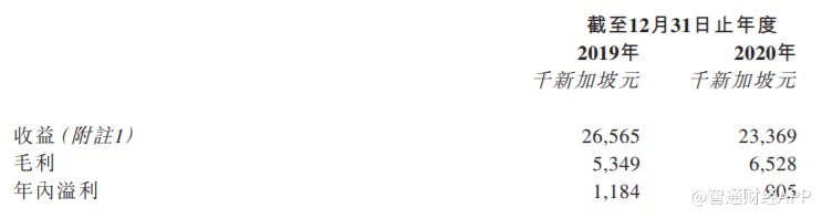 招股书显示,公司2019年及2020年,总收益2656.5万新加坡元及2336.9万新加坡元。毛利分别为534.9万新加坡元及652.8万新加坡元;年度/期内溢利分别118.4万新加坡元及90.5万新加坡元。