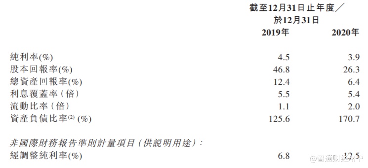 公司2019年及2020年净利率分别为4.5%及3.9%,总资本回报率分别为12.4%及6.4%,资产负债率分别为125.6%及170.7%。