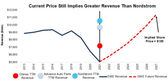 保持在上述的利润率和增长率下,Gamestop公司在2027年时会获得超过110亿美元的收入,超过了诺德斯特龙,Advance Auto Parts和Chewy。