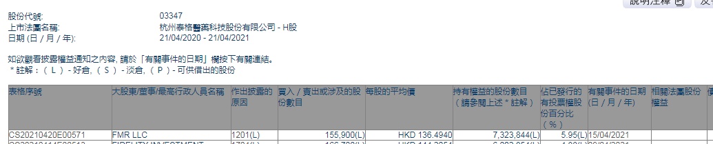 智通财经APP获悉,香港联交所最新资料显示,4月15日,FMR LLC减持泰格医药(03347)15.59万股,每股作价136.494港元,总金额约为2127.9万港元。减持后最新持股数目约为732.38万股,最新持股比例为5.95%。
