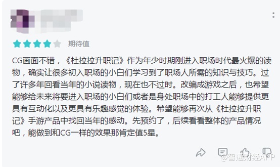 4月19日,公司在B站、TapTap等多个平台同步首曝了旗下《杜拉拉升职记》新游CG,全网同步开启预约,获得市场高度关注。智通财经APP观察到,《杜拉拉升职记》吸量效果突出,根据官网显示短时间内预约量已破万,多个用户给予CG好评的同时,也表达了对游戏的期待。