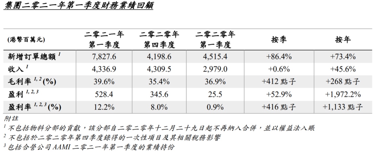 4月20日,ASM太平洋发布2021年的第一季度业绩,其报告期内的收入为43.37亿港元(下同),同比增长45.6%;净利润为5.28亿元,同比增长1972.2%;且公司新增订单总额为78.28亿元,同比增长73.4%。