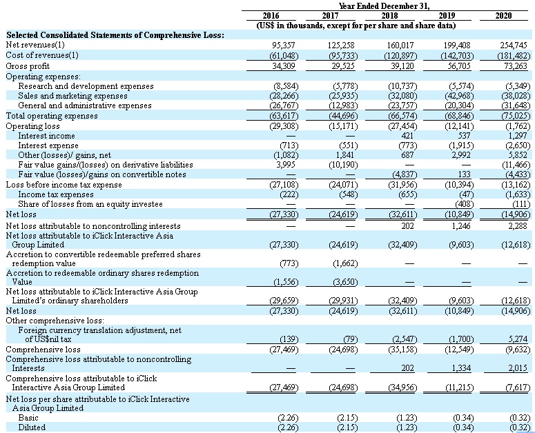 智通财经APP获悉,爱点击(ICLK.US)向美国SEC递交了20F报告,披露了公司截至2020年12月31日的2020年年报和最新股权结构。财报显示,该公司2020年净营收2.55亿美元,上年同期为1.99亿美元。