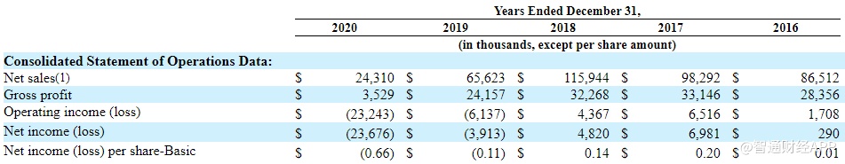 财报显示,该公司2020年净销售额为2431万美元,上年同期为6562.3万美元;净亏损2367.6万美元,上年同期为391.3万美元;基本每股亏损0.66美元,上年同期亏损0.11美元。