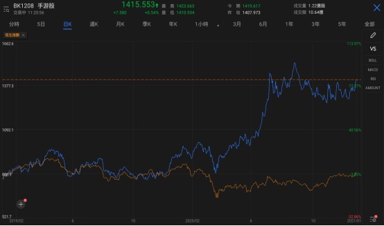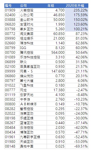 受疫情影响,受惠于宅经济的手游股成绩亮丽,整个板块自去年第二季度起跑嬴大市。不过个股仍表现有分歧,港股30家手游公司,去年共17家录得升幅,当中火岩控股﹑心动公司﹑金山软件﹑友谊时光,及家乡互动升幅最为显着,分别增幅235%、176%、150%、124%及100%。