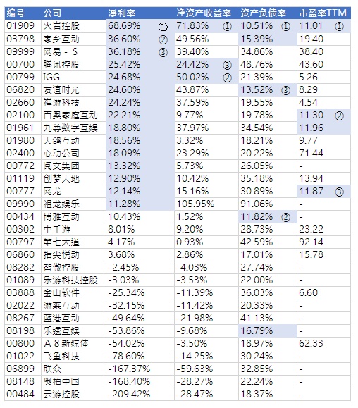 所以资产负债率较低者较可取,火岩控股、家乡互动、友谊时光、博雅互动等均是资产负债率不超过20%的手游企业,意味未来在资金运用方面更能做到「进可攻、退可守」