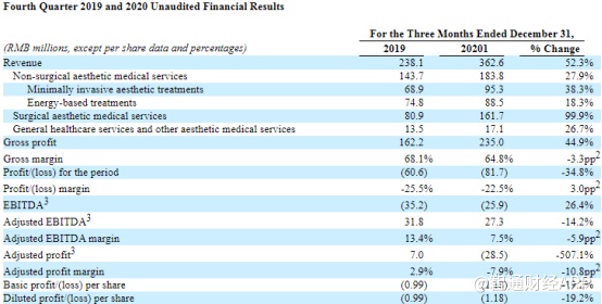 医美国际之所以能在业绩发布后股价迅速回升,关键在于其后疫情时代收入增长表现可圈可点。该公司Q4营收3.63亿元(人民币,下同),较上年同期2.38亿元增长52.3%;毛利润为2.35亿元,同比增长44.9%。