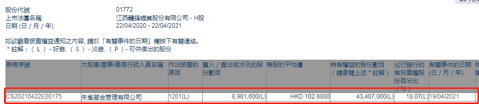 智通财经APP获悉,香港联交所最新资料显示,4月19日,朱雀基金管理有限公司减持赣锋锂业(01772)898.16万股,每股作价102.88港元,总金额约为9.24亿港元。减持后最新持股数目为4340.7万股,最新持股比例为18.07%。