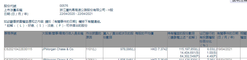 智通财经APP获悉,香港联交所最新资料显示,4月19日,摩根大通增持浙江沪杭甬高速公路股份有限公司(00576)97.8086万股,每股作价7.3742港元,总金额约为721.2602万港元。增持后最新持股数目约为1.15198亿股,最新持股比例为8.03%。