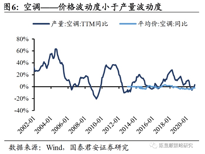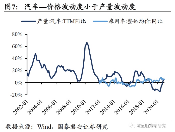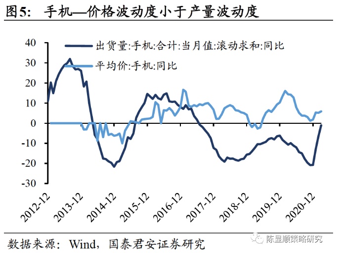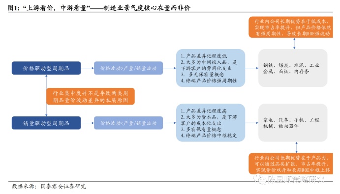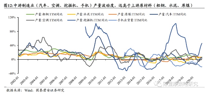 制造业产成品多为销量驱动型的周期品。根据量价波动度的不同,我们把主要工业品可分为销量驱动型和价格驱动型,销量驱动型产品集中在制造业,如家电、汽车、手机、工程机械,其长期产量/销量的波动度远高于价格波动度。价格驱动型产品集中于上游,如钢铁、煤炭、水泥、工业金属,其价格波动度远高于产销量的波动度。两者共同点是需求均受宏观经济周期影响,但量价敏感度完全不同。