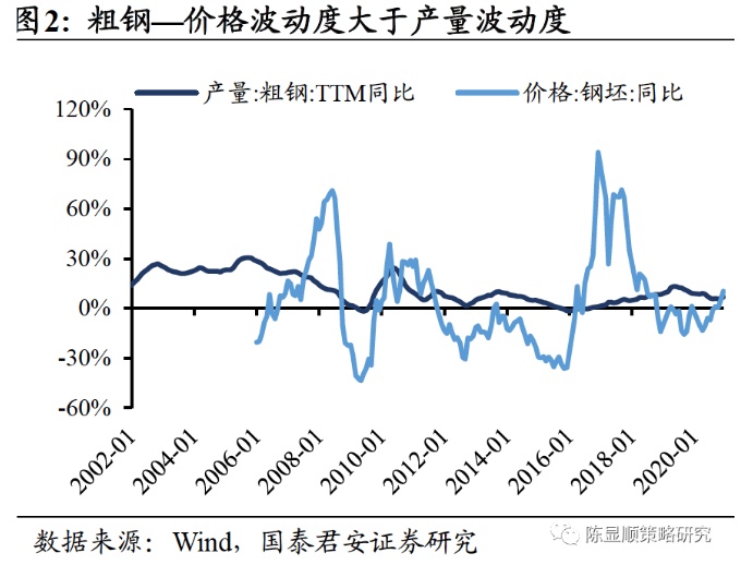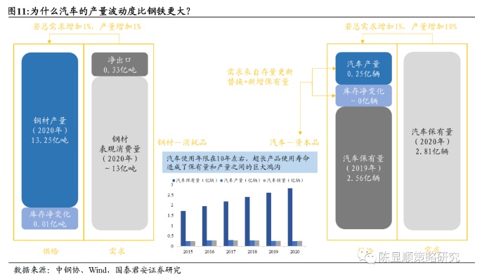 产品使用寿命决定了“中游看量”。价格驱动型和销量驱动型周期品的核心区别是产品使用寿命,是作为下游客户的费用化支出还是成本化支出存在,即是消耗品还是资本品、有无“保有量”的概念。价格驱动型周期品是消耗品,属于下游的费用化支出,其需求是流量概念,实际消费量等于一段时期的产量加库存净变动。销量驱动型周期品多为资本品,其需求是存量概念,实际消费量等于特定时点的保有量。我们以钢铁和汽车举例,解释两种类型周期品产量弹性上的差异。