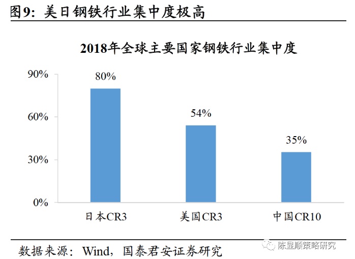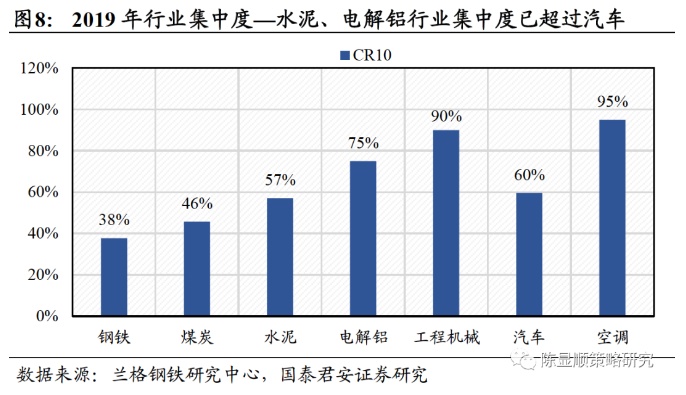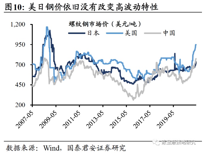 行业集中度并非上中游价格弹性差异的主因。为什么上游原材料价格更易暴涨暴跌?过去有一种普遍的解释是,上游供给格局更分散、产品差异化程度低,加剧了产能的周期性。但实质在供给侧改革之后,上游原材料行业整体集中度有显著提升,原材料中水泥(2019年CR10约为57%)、电解铝(2019年CR10约为75%)已经接近或超过某些制造业(汽车,2019年CR10约为60%),但依旧没有改变电解铝、水泥价格高波动的特性。我们也可以以海外为例证,钢铁行业集中度极高的日本、美国,钢价亦有强波动性。