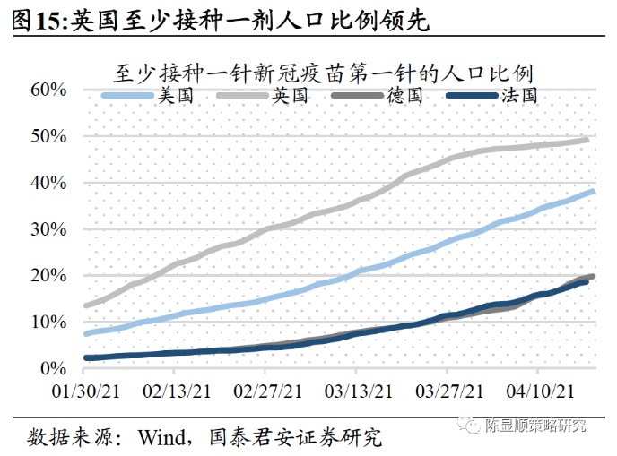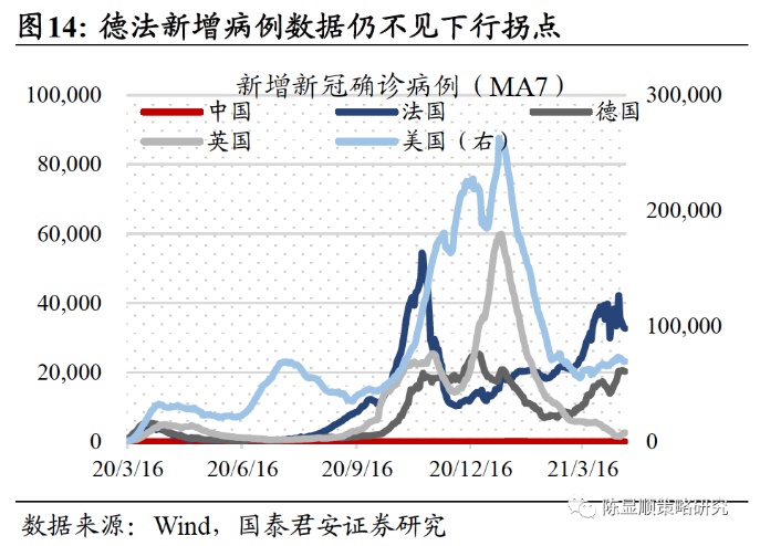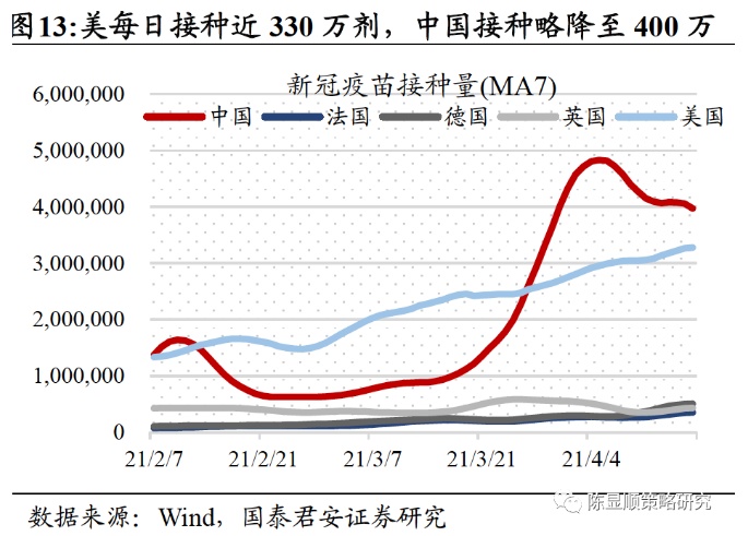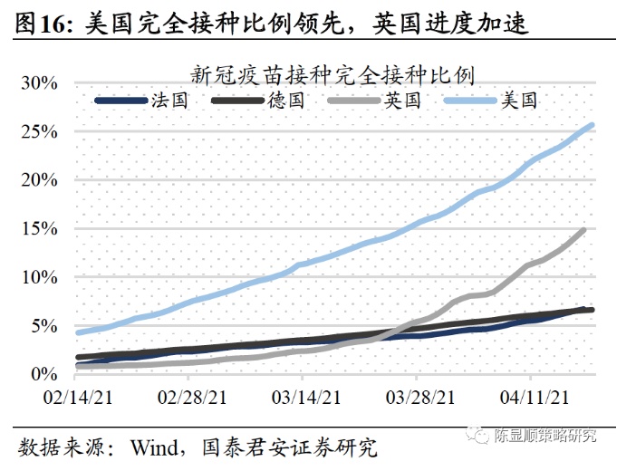 新冠疫苗接种:中国接种速度保持领先,德法疫情仍不见好转迹象。截止4月19日,法、德7日移动平均新增确诊病例环比两周前变化为-10.52%/39.87%,整体看新增病例数仍处高位,下行拐点不明显。英、美分别环比变化-23.09%/4.67%。疫苗接种速度方面,中国接种速度保持领先,4月17日平均每日接种量397万,但速度有所减缓。美、英七日平均接种速度分别为328万/44万剂,美国日接种速度持续提升。疫苗接种比例方面,每百人接种量角度看,英、美分别为63.02/62.61剂,法、德接种进度分别为24.97/26.19剂,中国为13.35剂;至少接种第一针的比例上,英国领先(为49.15%),美国38.13%。法、德分别为18.58%/19.75%。疫苗完全接种人群比例上,美国增至25.67%,环比两周前增加6.66个百分点;英国第二针接种进度加快,环比增加6.73个百分点至14.86%,法德分别为6.69%/6.63%。