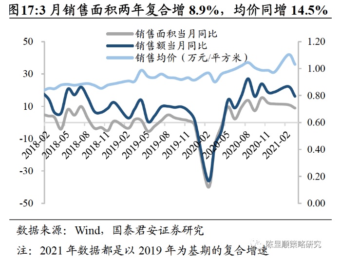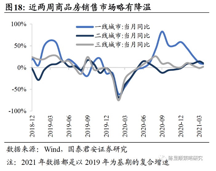 地产销售:地产销售受调控影响降温,土地供给收紧溢价上行。3月商品房销售面积1.86亿平方米,同比增长38.07%,过去2年复合增速为8.88%,较2月下滑近2个百分点。随着热点城市需求调控政策不断出台,市场持续降温,一、二、三线城市商品房成交面积同比变化53.8%、66.4%、21.0%,相比2019年复合增速为8.2%、10.2%、1.9%。土地方面,“两集中”政策下土地供给量缩而溢价率走高。截至4月18日供应土地占地面积累计同比变化为-11.5%。但与此同时,由于房地产企业近期销售资金回笼良好,拿地意愿不弱,近期地价溢价率逐步上行。4月18日,八周成交土地溢价率中位数为16.6%,较两周前上涨2.98个百分点。由于“两集中”政策下土地供应主要集中在下半年,土地较贵的问题短期或将持续。