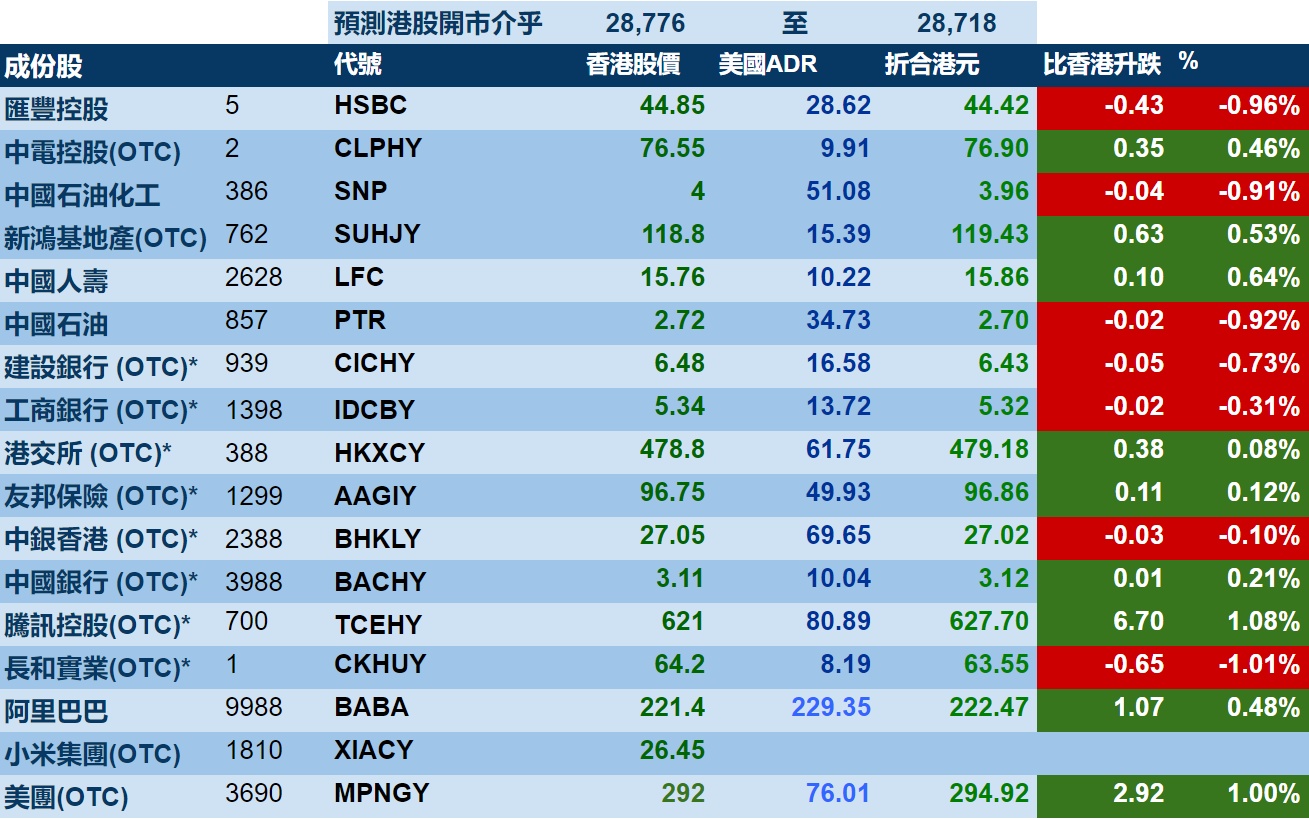 智通财经APP获悉,周四美股三大指数齐跌,港股ADR指数小幅上涨,按比例计算,收报28776点,涨21.43点或0.07%。