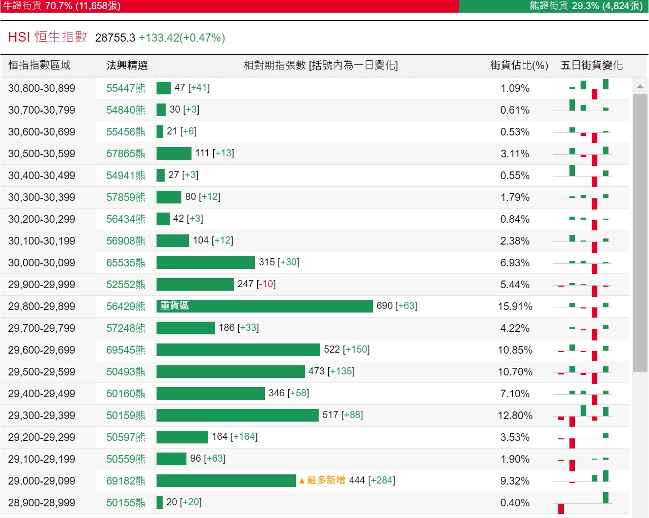 法兴恒指牛熊证街货分布图中的数据显示,熊证街货重货区在29800-29899区间,该区间最新熊证数量为690张,较上一交易日增加63张;最多新增在29000-29099区间,该区间最新熊证数量为444张,较上一交易日增加284张。