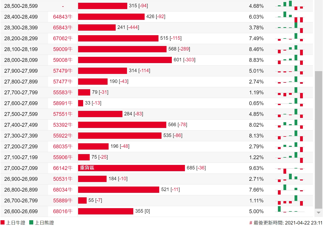 牛证街货重货区在27000-27099区间,该区间最新牛证数量为685张,较上一交易日减少36张;最多减少在28000-28099区间,该区间最新牛证数量为601张,较上一交易日减少303张。