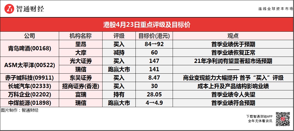 瑞信称,中煤能源今年首季业绩符合市场预期,净利润为35亿元人民币,同比上升441%,主因强劲的煤炭和煤化工价格以及更高的产量和销量所带动。上调其2021-23年度盈利预测38.5%/35.7%/28.1%,反映更高的销量,以及煤炭和煤化工价格预期。