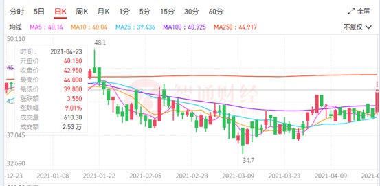 在创新研发及资本市场带来的双重利好下,4月23日,复宏汉霖股价盘中稳定上扬,并于盘中触及最高价每股44.00港元,创下近3个月来的股价新高。最终公司股价报收每股43.15港元,涨幅达到9.52%。