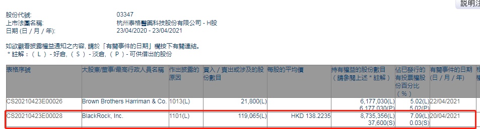 智通财经APP获悉,香港联交所最新资料显示,4月20日,贝莱德增持泰格医药(03347)11.9065万股,每股作价138.2235港元,总金额约为1645.76万港元。增持后最新持股数目为873.54万股,最新持股比例为7.09%。