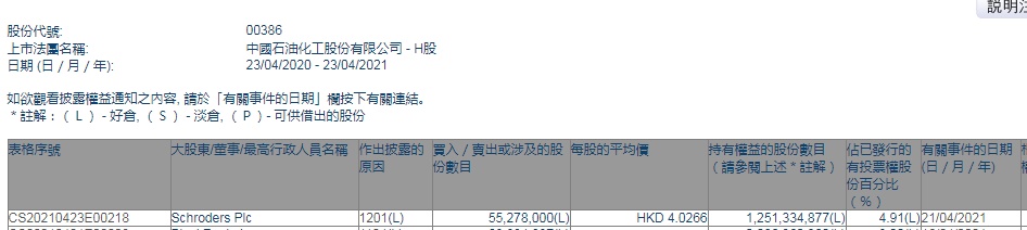 智通财经APP获悉,香港联交所最新资料显示,4月21日,Schroders Plc减持中国石油化工5527.8万股,每股作价4.0266港元,总金额约为2.2258亿港元。减持后最新持股数目约为12.51335亿股,最新持股比例为4.91%。