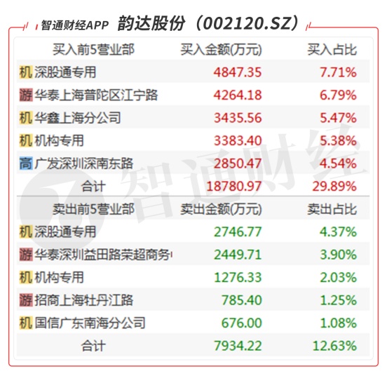 韵达股份(002120.SZ):多主力现身龙虎榜,深股通对倒净买入2100万元,机构对倒净买入2107万元,买三是知名游资的席位买入3436万元。当日净买入1.12亿元,该股今日底部涨停,受益政策限价,行业竞争格局变好。