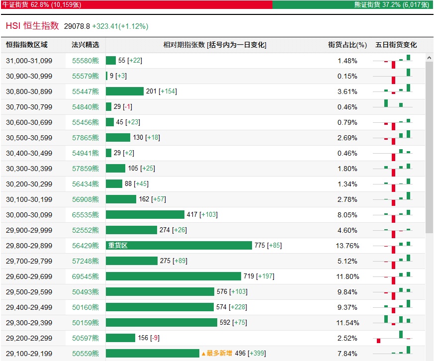 法兴恒指牛熊证街货分布图中的数据显示,熊证街货重货区在29800-29899区间,该区间最新熊证数量为775张,较上一交易日增加85张;最多新增在29100-29199区间,该区间最新熊证数量为496张,较上一交易日增加399张。