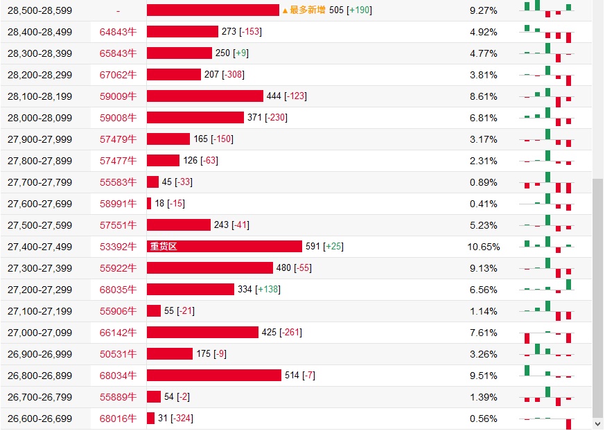 牛证街货重货区在27400-27499区间,该区间最新牛证数量为591张,较上一交易日增加25张;最多新增在28500-28599区间,该区间最新牛证数量为505张,较上一交易日增加190张。