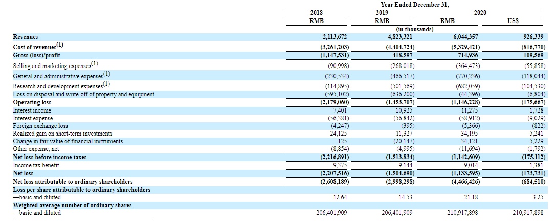 财务数据方面,该公司2018、2019和2020年营收分别为21.14亿、48.23亿和60.44亿元(人民币,下同),净亏损分别为22.08亿、15.05亿和11.34亿元,归属于普通股股东的净亏损分别为26.08亿、29.98亿和44.66亿元,归属于普通股股东基本和摊薄每股亏损分别为12.64、14.53和21.18元。