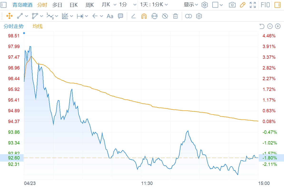 不过,从股价走势来看,市场似乎对青岛啤酒的一季报并不买账。4月23日,青岛啤酒A+H股双双走弱:其H股高开低走,截止收盘下跌2.34%,报于75.2港元;其A股亦是如此走势,截至收盘下跌1.8%,报于92.6元。
