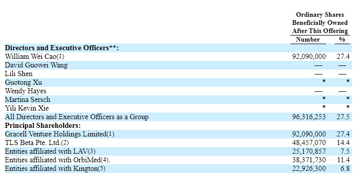截至2021年3月31日,亘喜生物创始人、董事会主席兼首席执行官William Wei Cao持有公司27.4%的股权。