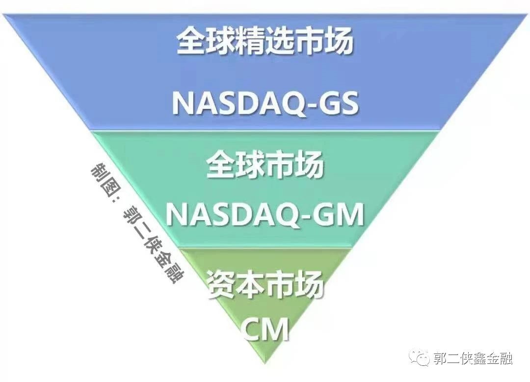 纳斯达克有三个层次,从高到低依次是:全球精选市场(The Nasdaq Global Select Market, GS );全球市场(The Nasdaq Global Market,GM);资本市场(The Nasdaq Capital Market,CM)。