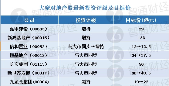 智通财经APP获悉,大摩发布研究报告称,香港地产股中首选新鸿基地产(00016)、嘉里建设(00683)及信和置业(00083),将信置评级由“持有”升至“增持”,目标价升4%至12.5港元。